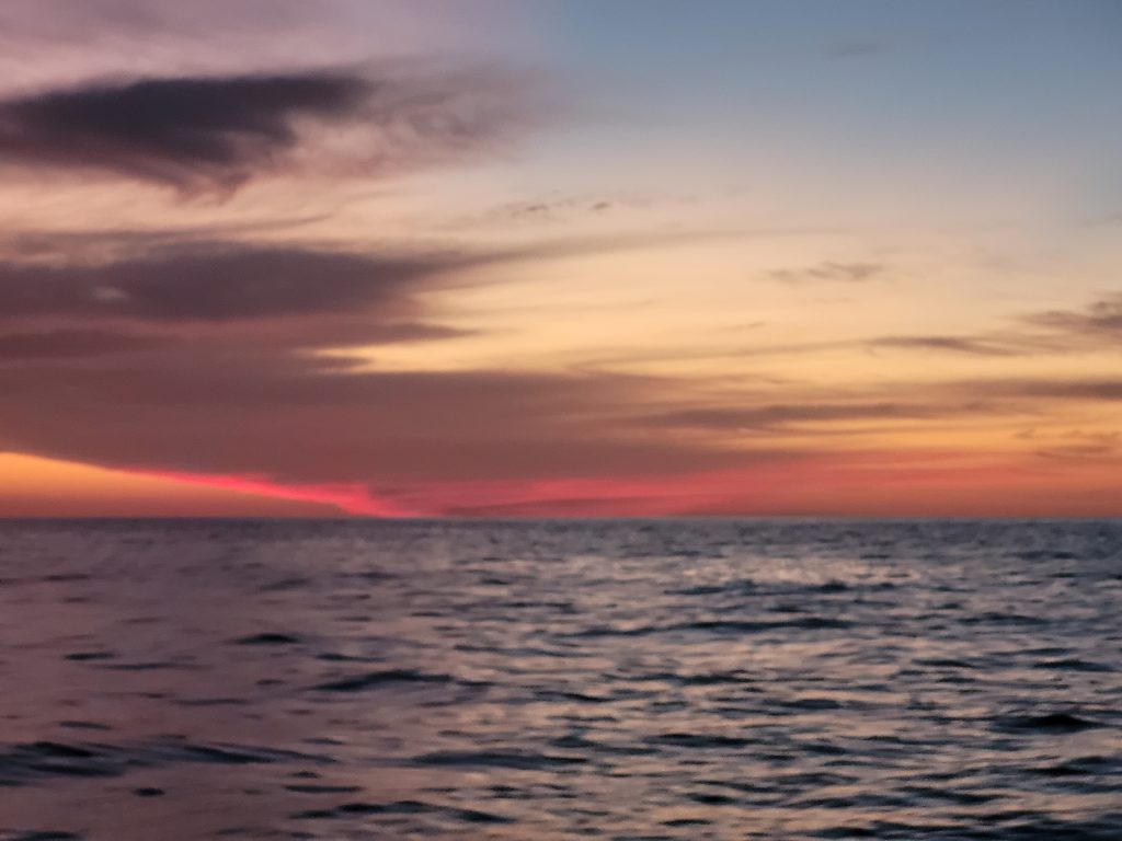 i løbet af natten er der ingen aktivitet på VHF-radioen og vi har ingen skibe på AIS’en. Det er meget mærkeligt og selvom vores egen GPS-position hele tiden ser troværdig ud kan vi ikke undgår at bekymre os lidt om at ramme et rev i mørket.