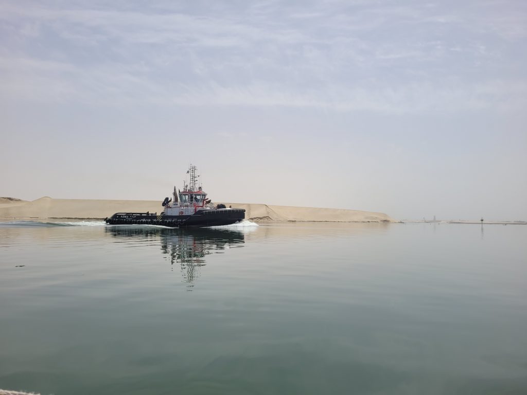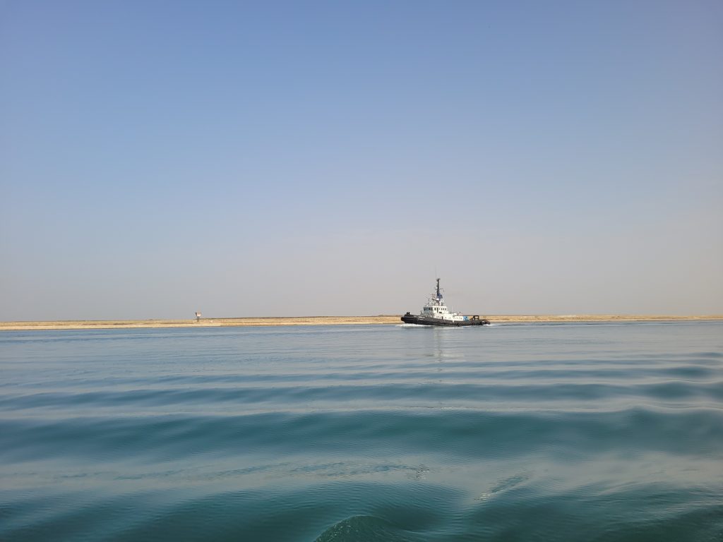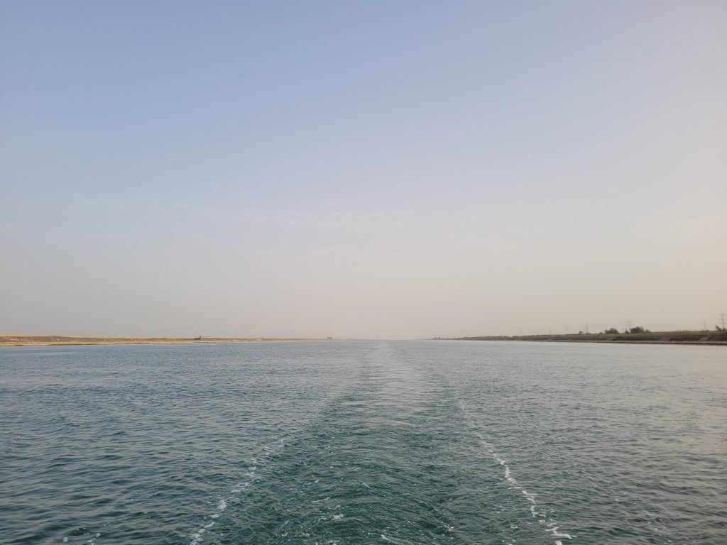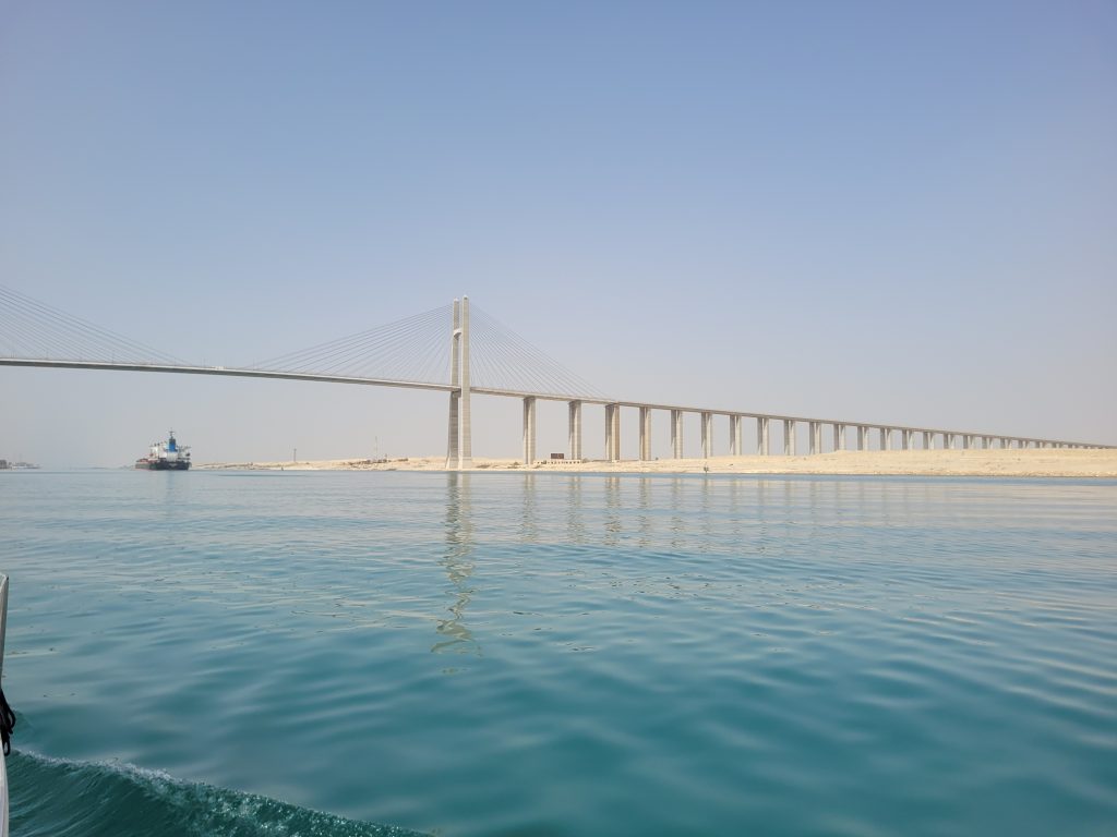 Der er ingen sluser og det er i det hele taget en relativt begivenhedsløs tur. Landskabet er sandfarvet og fyldt med militære anlæg og flydende svingbroer som kan skabe hurtig forbindelse fra den ene bred til den anden hvis det kræves. Vi ser den gigantiske mindeplade fra den gang i 2021 hvor det store Evergreen fragtskib lagde sig på tværs og forsinkede leverancen af millioner af elektronikdimser og tøj til Europa.
