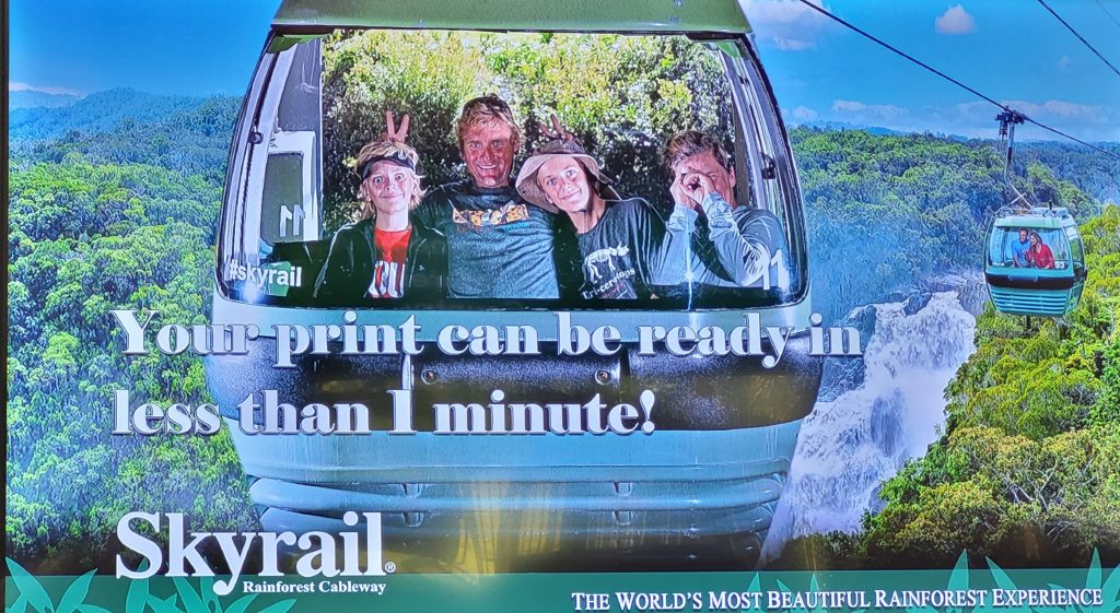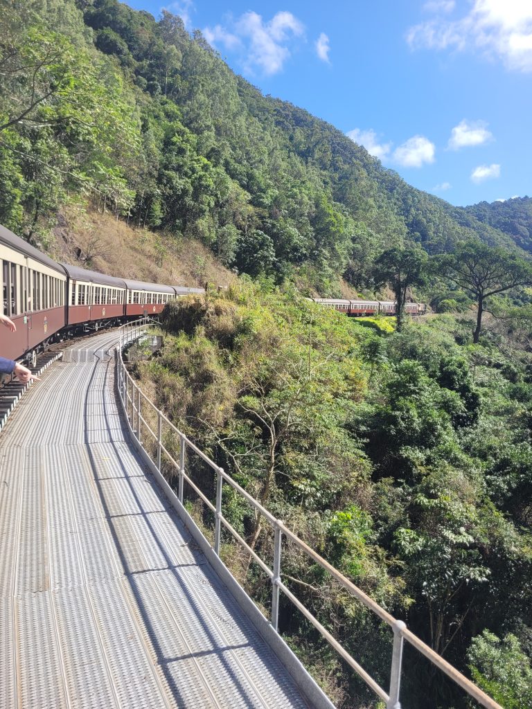 Vi tager den rimeligt med ro, men når også en tur med tog og kabelbane og vi får smagt kænguru. Man bader ikke i havet her, for der er saltvandskrokodiller og dem spøger man ikke med. Vi har mødt australiere på vejen som fortæller hvordan krokodillerne holder øje og angriber hvis man bader samme sted flere dage i træk eller bare angriber….. Dagens avisoverskrift er om en mand der er forsvundet og man mener han er blevet spist af en krokodille.